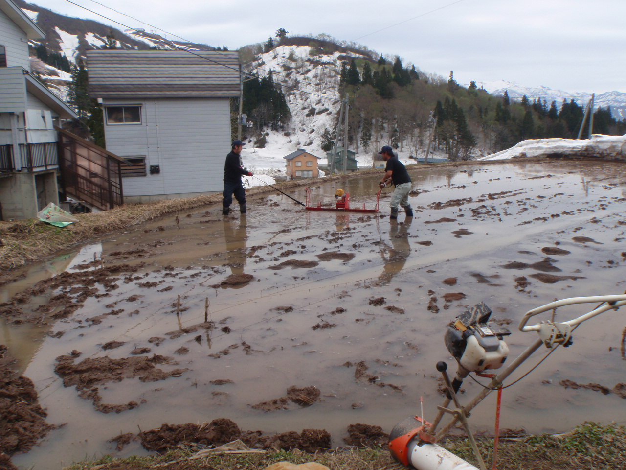 2012.4.28 苗箱を高温にさらして芽と根が出てきたら、田んぼに置きます。 そのときにたんぼを平らにしていないと均一に成長しないので、機械を使って二人がかりで整地します。 そして保温用のシートをかけて、後は芽が出そろうまでそっとしておきます(゜Д゜)